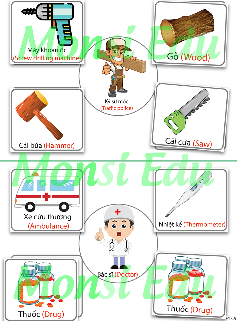 • Bác sĩ: thuốc, xe cứu thương, nhiệt kế, tai nghe nhịp tim.