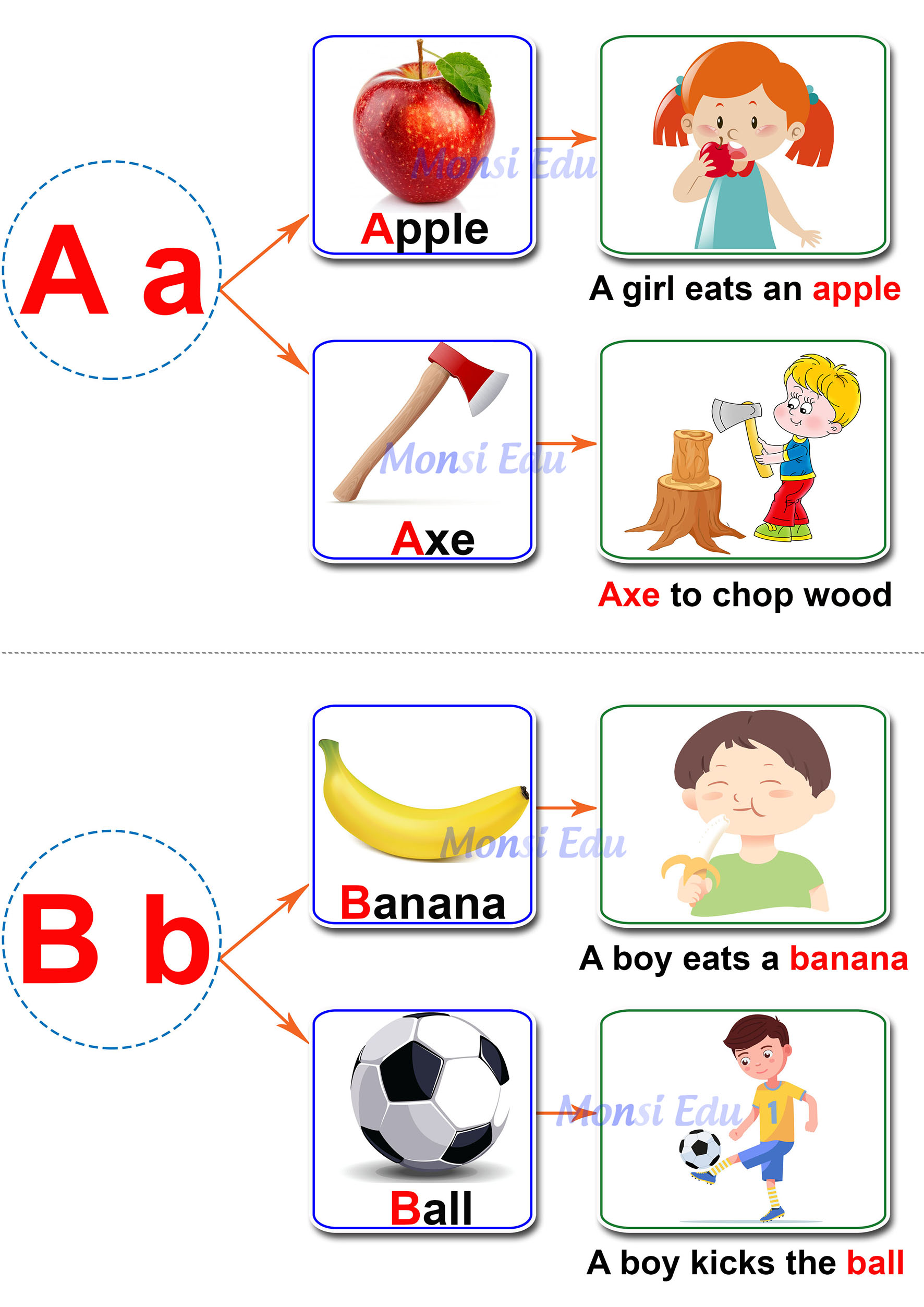 Gồm 26 Chữ Cái Alphabet trong Tiếng Anh: A, B, C, .. Y, Z. Mỗi chữ cái sẽ kèm theo 2 từ vựng tương ứng, mỗi từ vựng cũng có hành động tứng ứng kèm theo.  Cách trình bày tư mới giúp trẻ nhớ và học rất nhanh.